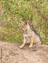 A pair of jackal pups playing near their den and waiting for parents inside Masai Mara National Reserve during a wildlife safari