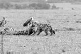 A baby hyena eating a kill in the plains of africa inside Masai Mara National Reserve during a wildlife safari
