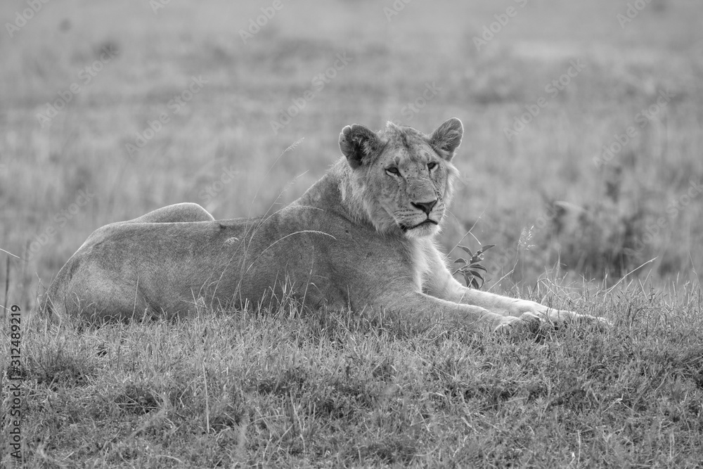 A lioness relaxing near a bush in the plains of africa inside Masai Mara National Reserve during a wildlife safari
