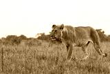 A lone lioness walking in the plains of Masai Mara National Reserve during a wildlife safari