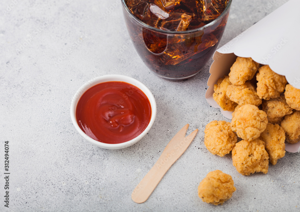 Crunchy southern chicken popcorn bites in white paper container for fast food meals with ketchup and glass of cola on light background.