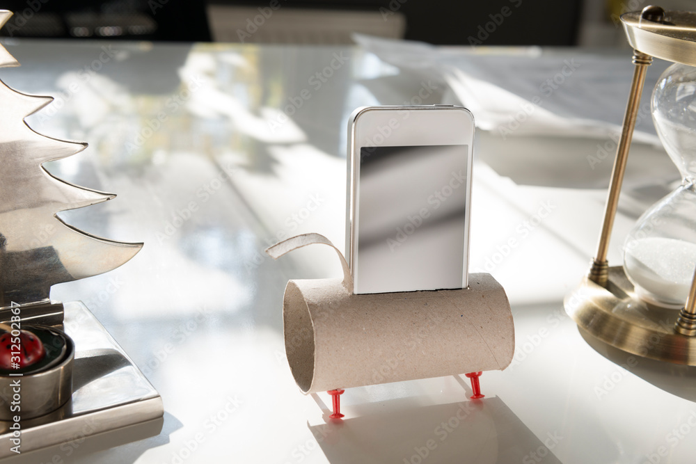 Practical solutions; toilet paper roll speaker and smart phone holder.