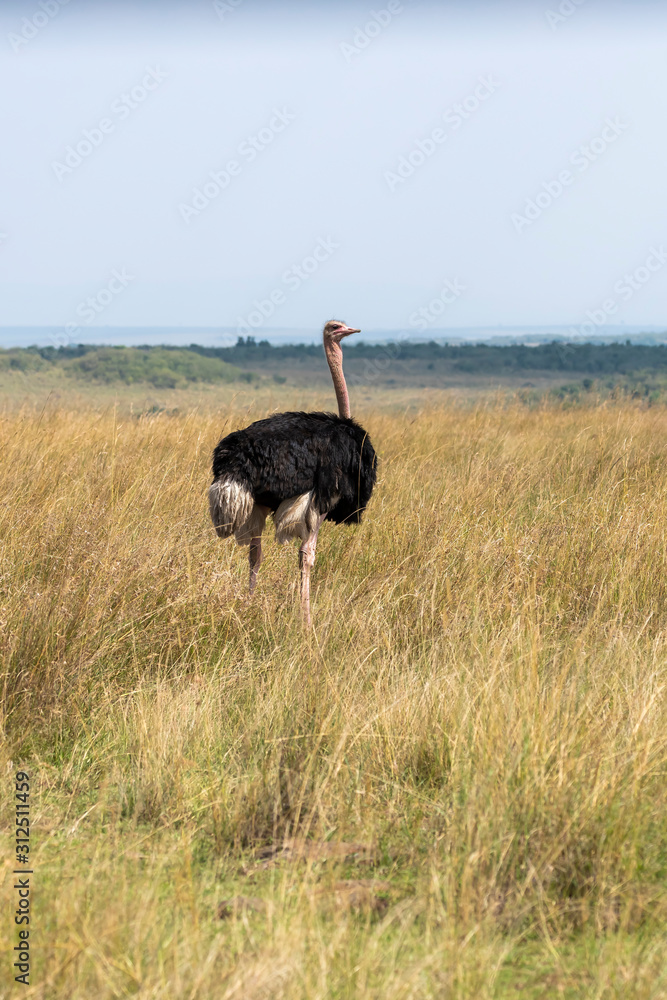 A male ostrich feeding in the high grasses inside Masai Mara National Reserve during a wildlife safari