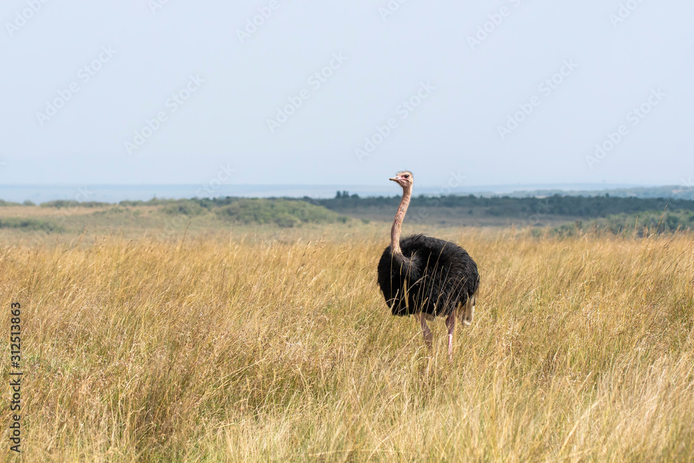 A male ostrich feeding in the high grasses inside Masai Mara National Reserve during a wildlife safari