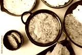 Assorted Indian food for lunch or dinner, rice, spinach lentils/Palak dal, Roti or naan, Alu Vadi and surnache kap / Yam fry. selective focus with Copy space
