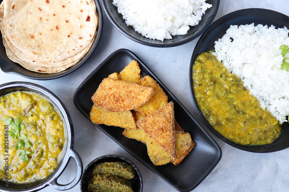 Assorted Indian food for lunch or dinner, rice, spinach lentils/Palak dal, Roti or naan, Alu Vadi and surnache kap / Yam fry. selective focus with Copy space