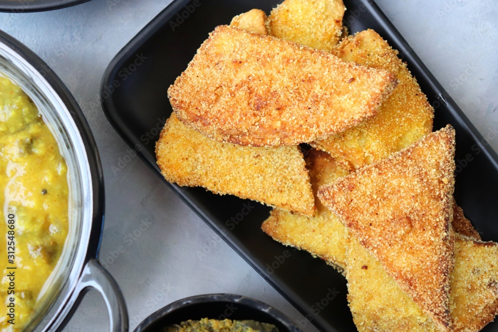 Assorted Indian food for lunch or dinner, rice, spinach lentils/Palak dal, Roti or naan, Alu Vadi and surnache kap / Yam fry. selective focus with Copy space