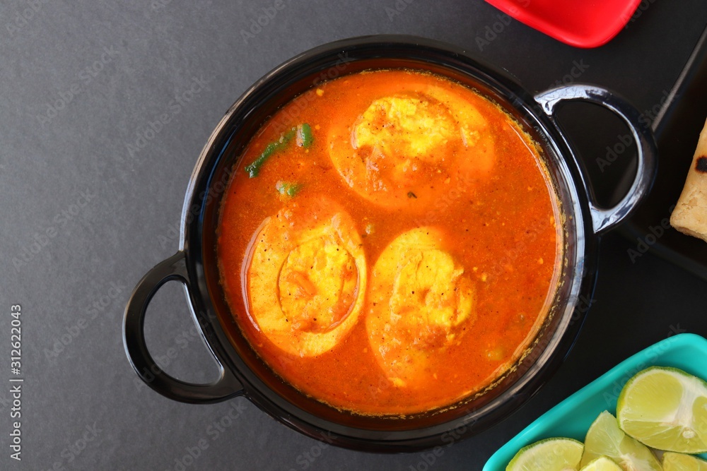 Indian non-vegetarian food- Homemade Egg Curry or Anda masala gravy, Indian spicy food, along with Roti, Lemon wedges and cucumber slices. Perfect Indian lunch. over light background with copy space.