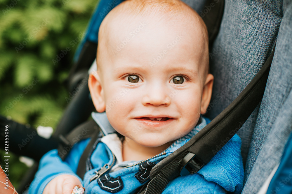 Close up portrait of adorable baby boy sitting in a stroller