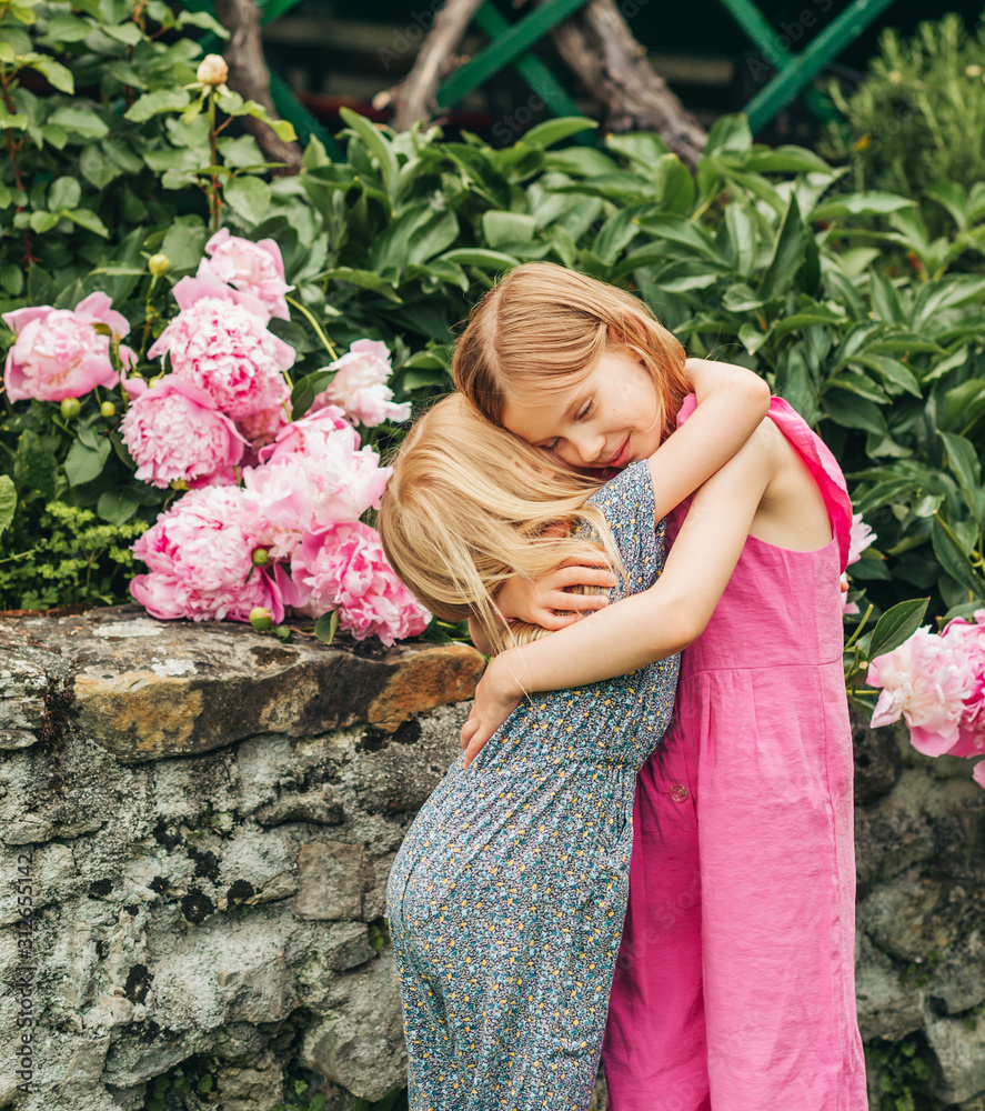 Outdoor portrait of two sweet little girls, kids playing together in summer garden