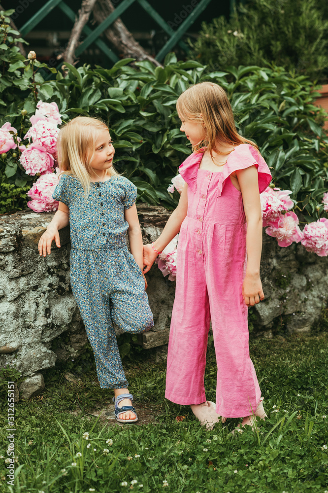 Outdoor portrait of two sweet little girls, kids playing together in summer garden