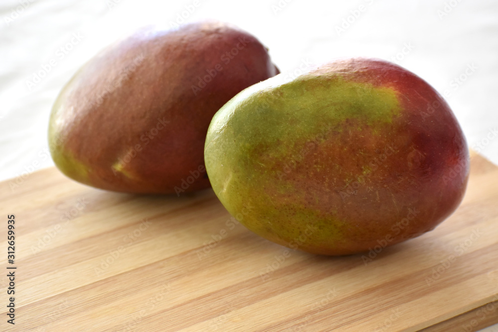 Mangoes on a bamboo cutting board. Selective focus. Copy space is on the left side.