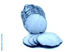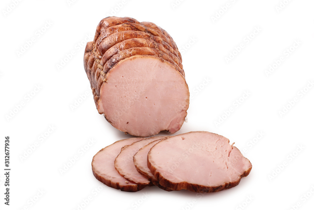 Smoked pork ham in sausage netting. Traditional sausage products white white background.