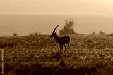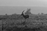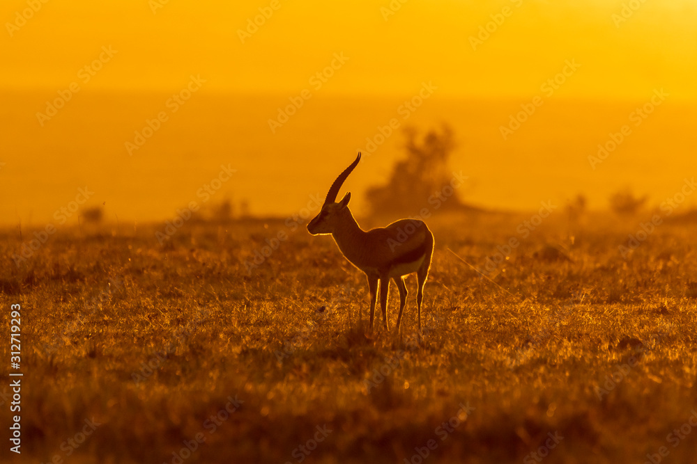 A male thompson gazelle grazing in the plains of Africa with a beautiful sunrise in the background during a wildlife safari inside Masai Mara National Reserve