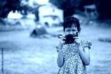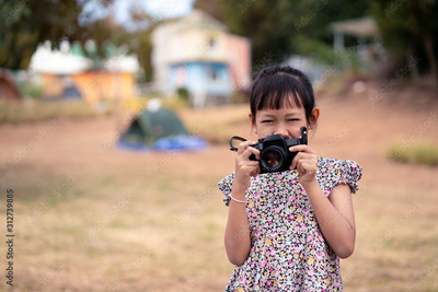 Asian little child girl holding film camera and taking photo