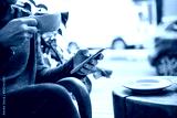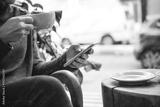The girl uses a cell phone and drinks delicious morning coffee in a cozy modern cafe.