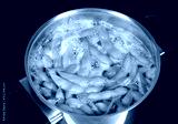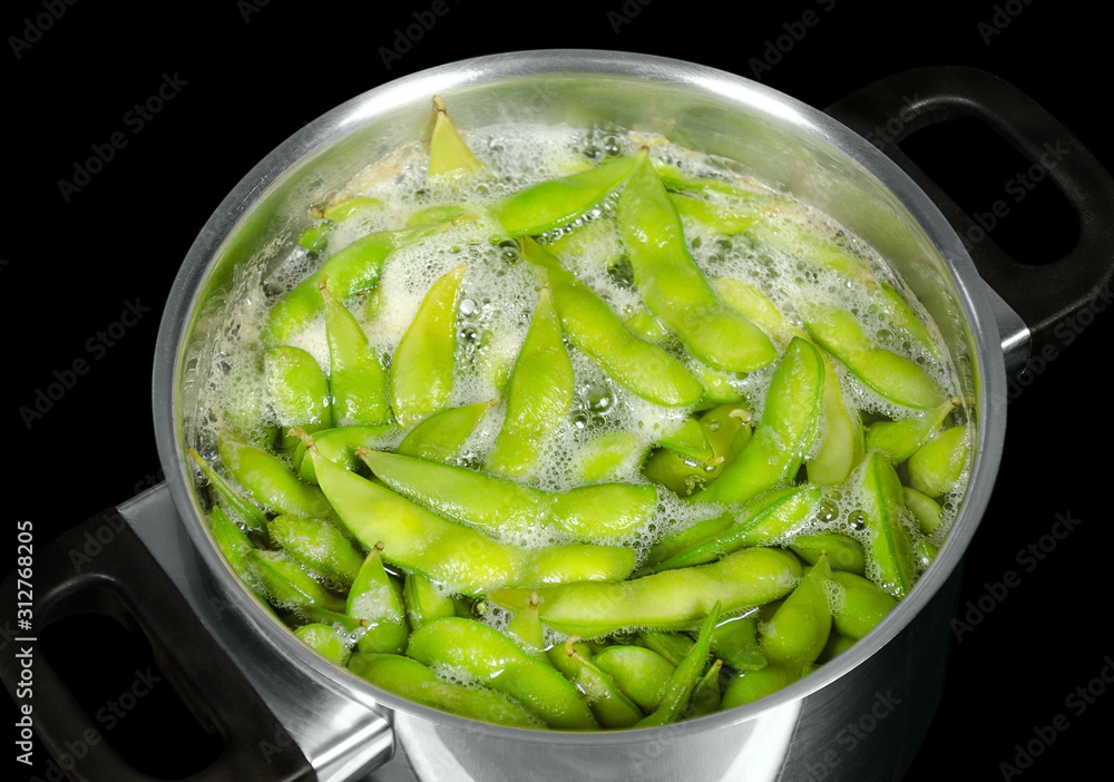Edamame, green soybeans, maodou, boiling in saltwater in a metal pot. Soy beans, Glycine max., a legume that bis rich on protein and edible after cooking. Closeup, macro food photo.