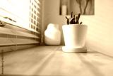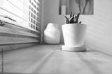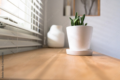 Green cactus, succulents on the windowsill with light soft background. Spring or summer greeting card. Home plants on the windowsill