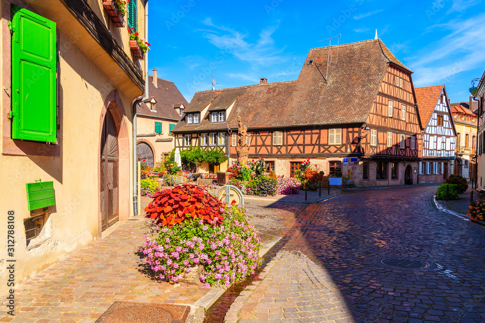 Beautiful traditional colorful houses in picturesque Kientzheim village, Alsace wine region, France