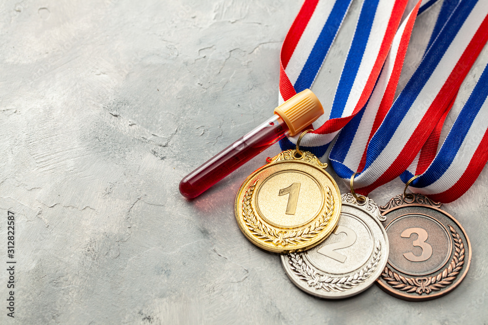 Doping test. Gold, silver and bronze medal and test tube with blood on a gray background
