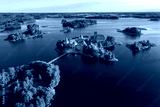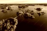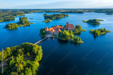 Blue lakes around old castle Trakai in Lithuania aerial view. View from above to Trakai castle