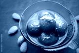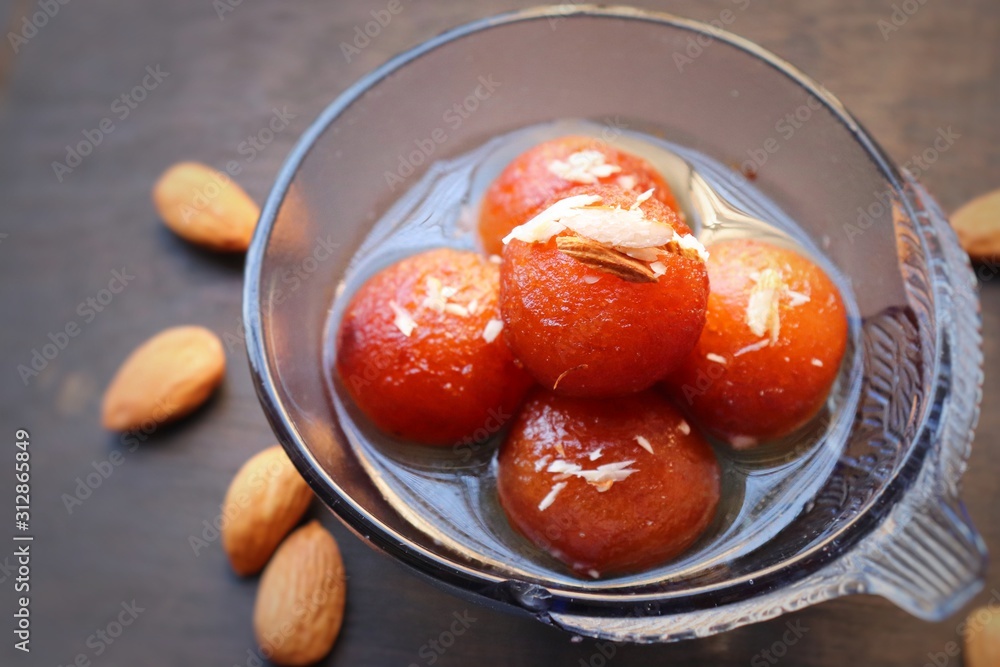 Gulab Jamun in a glass bowl on wood background with Almonds