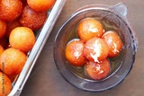 Gulab Jamun in a glass bowl on wood background with Almonds