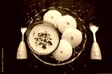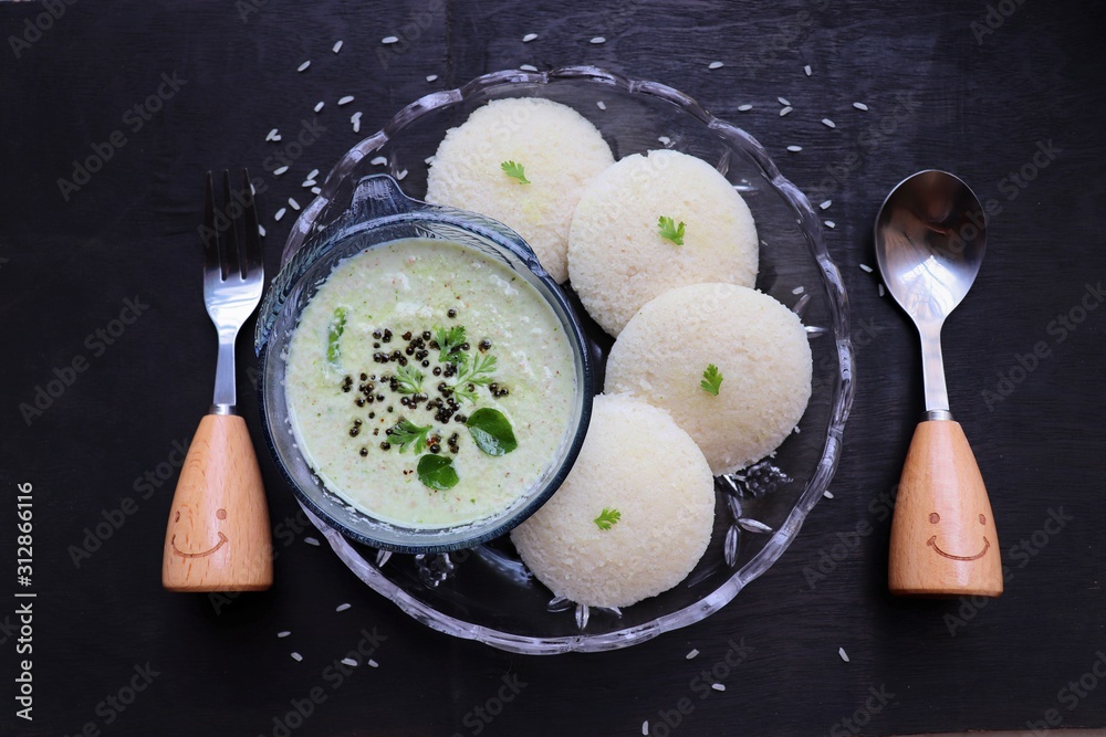 South Indian dish Idlis with Coconut Chutney over black background, Moody photography, ingredients and smiling spoons
