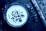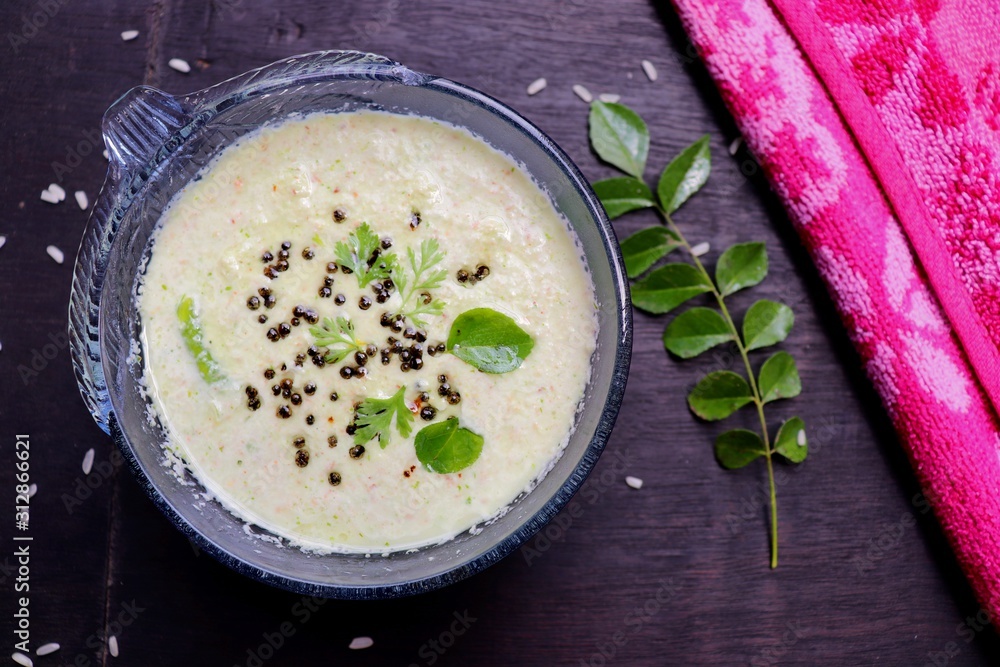 Coconut Chutney, South Indian side dish served with Idli and Dosa over black background, Moody photography