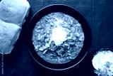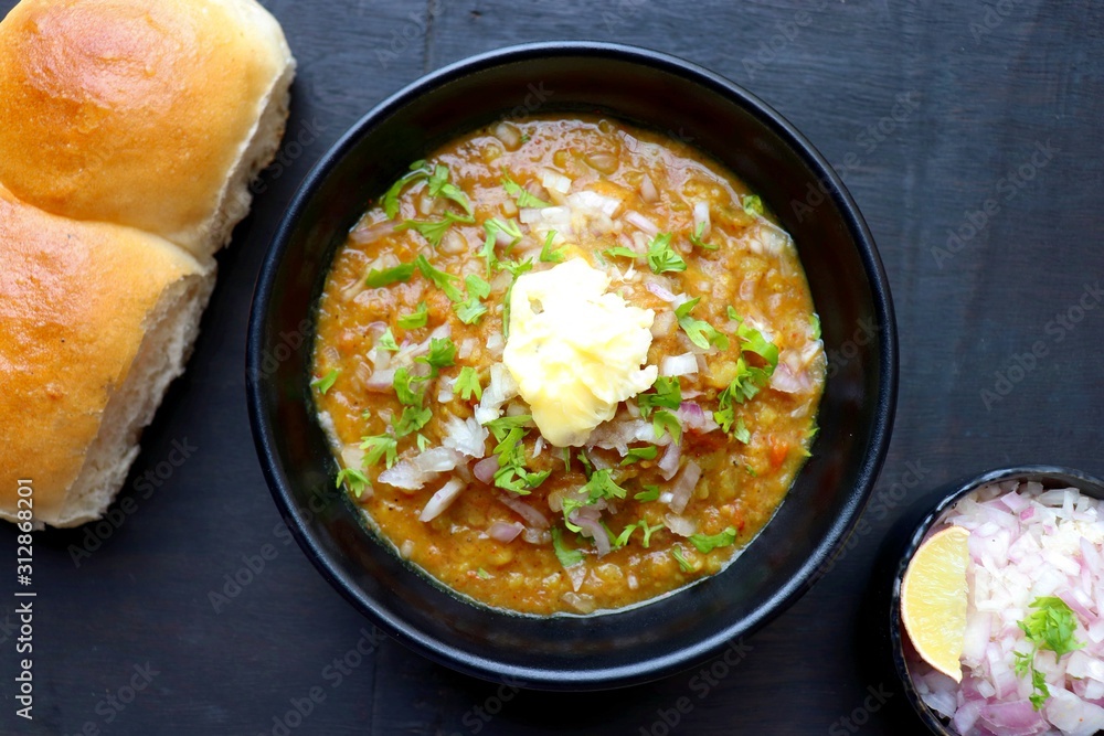 Indian Mumbai Street style Pav Bhaji, garnished with raw onions, coriander and Butter. Spicy thick curry made of out mixed vegetables, served with Bread