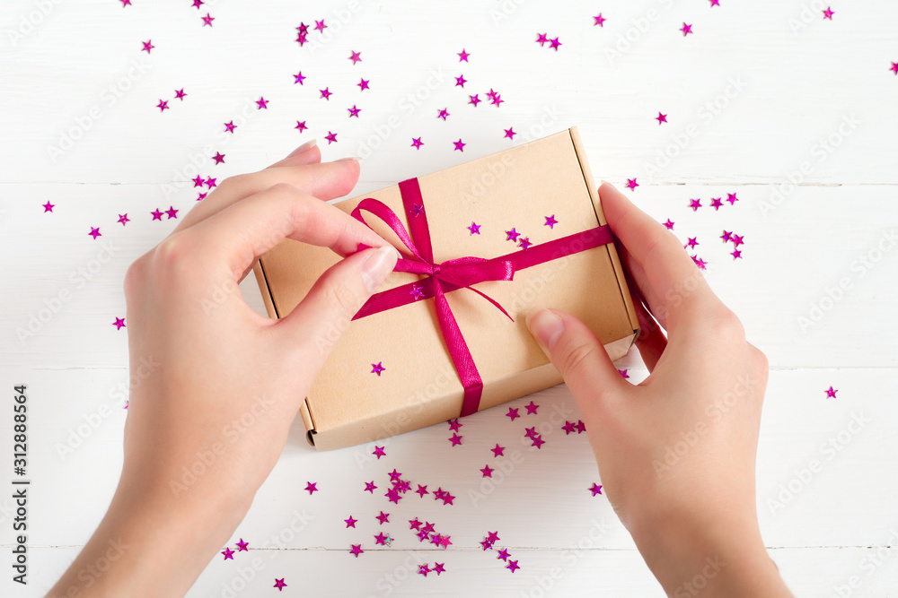 Girl opens a craft gift box on a white wooden background, top view. Gift wrapping in female hands, gift box, open present