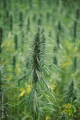 Hemp plant on field. Cannabis marijuana commercial cultivation.