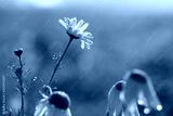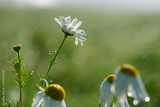Chamomile flowers on meadow with tiny morning dew water drops on petals macro