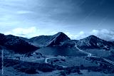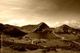 Enol lake in mountains with cows and sheeps on green pasture in national park Picos de Europa, Spain