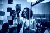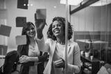 Creative businesswoman writing on sticky notes on a glass wall, female colleague looking.