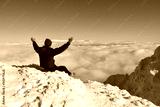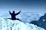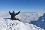 Happy mountaineer raise hand up on top of mountain. Climber enjoy on snowy mountain high above the clouds