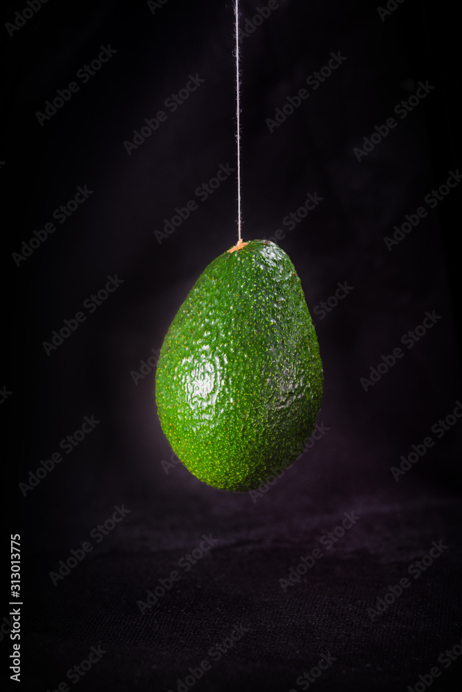 An avocado hangs on a black background.