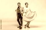 stylish dancers looking at camera while dancing boogie-woogie on grey background