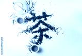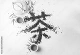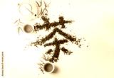Traditional Chinese hanzi Calligraphy "Tea" stowed by tea on white fabric surface. Composition tea set with teapot, cups and leafs.