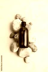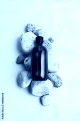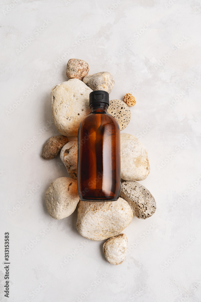 Environmentally clear nature composition with a glass bottle of liquid, shampoo over moss with stones, minerals, sea, shell for organic cosmetic products on white with copy space.
