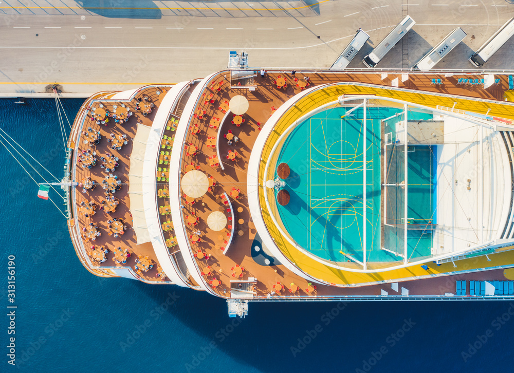 Aerial view of luxury cruise liner. Top view of basketball field, people is sitting at the tables, umbrellas on the cruise ship in summer. View from above of restaurant on the wooden deck. Resort