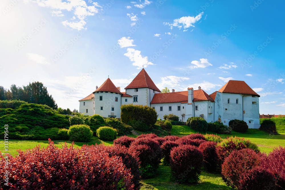 View of Castle on Street in Old city of Varazdin in Croatia. Panorama and Cityscape of famous Croatian town in Europe in summer. Travel and tourism for tourists.