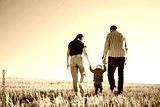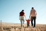 Happy Young Family Mom and Dad with Their Little Son Enjoying Summer Weekend Picnic Outside the City in the Field at Sunny Day Sunset, Vacation Time Concept