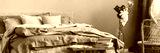 Pile of books on wooden bench in elegant bedroom interior with pastel pink, beige and blue bedding