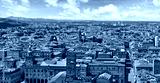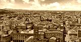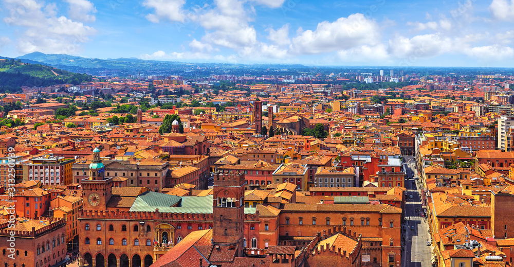 Bologna Italy. Panoramic aerial view of old town with terracotta houses and tegular roofs with central square Piazza Maggiore and main street with blue sky clouds over horizon.