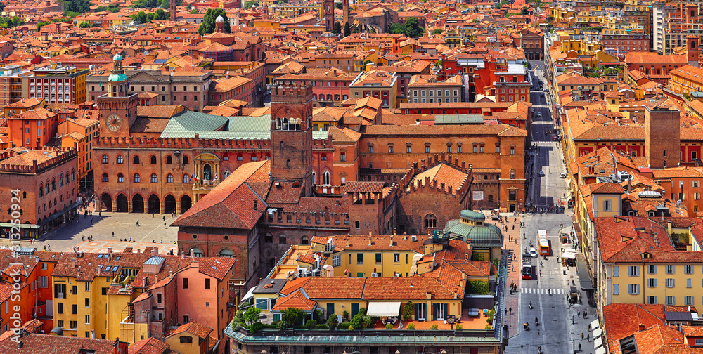 Bologna Italy. Panoramic aerial view of old town with terracotta houses and tegular roofs with central square Piazza Maggiore and main street.