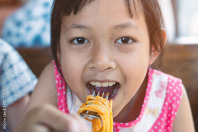 Asian child girl eating a plate of tasty Italian spaghetti with smiling and happy