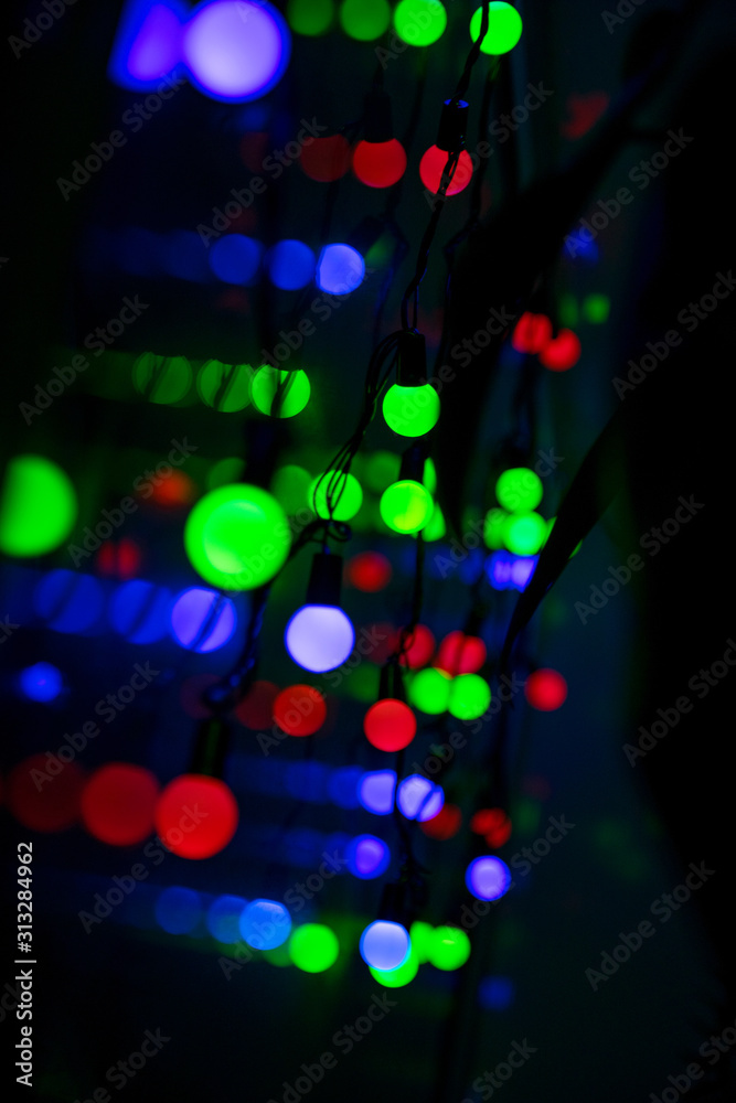 Multi-colored glare from garlands in the form of abstraction in the dark
