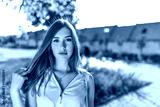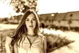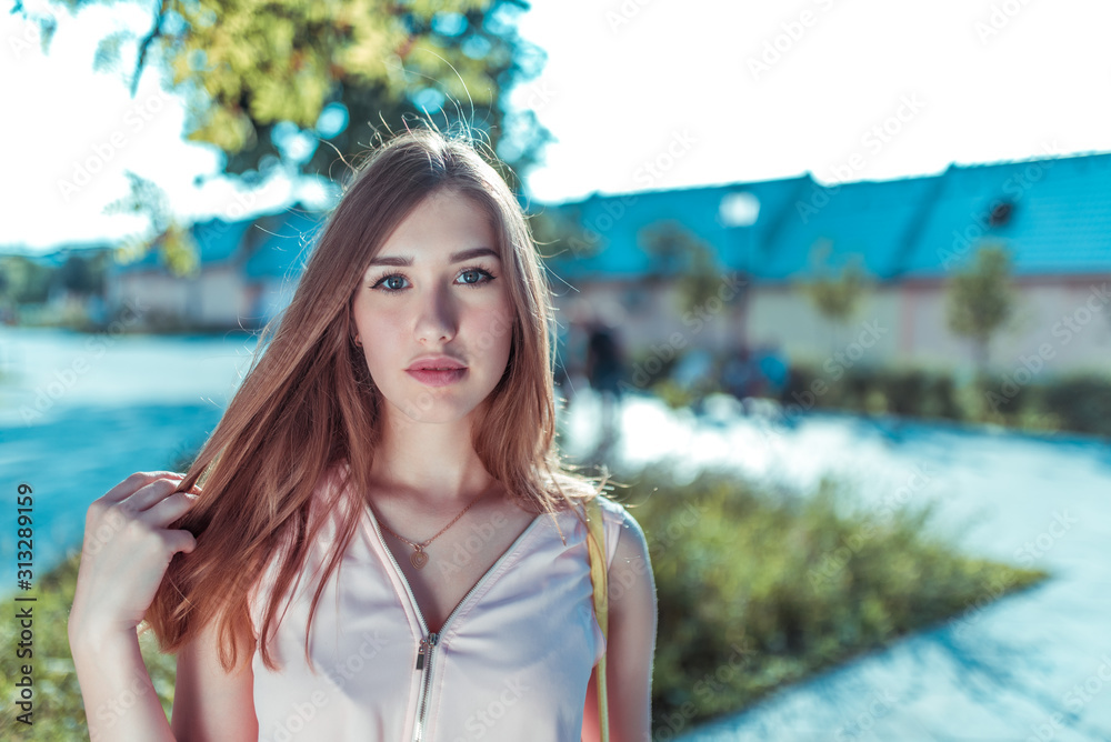 Closeup portrait, beautiful summer girl in the city, pink dress, long hair casual makeup. Emotions of comfort and relaxation on a sunny day off. Free space for copy text.
