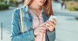 Close-up, girl in jeans, stands summer in city, hands smartphone. Reads writes message online application, social networks sms. Watching videos on phone.